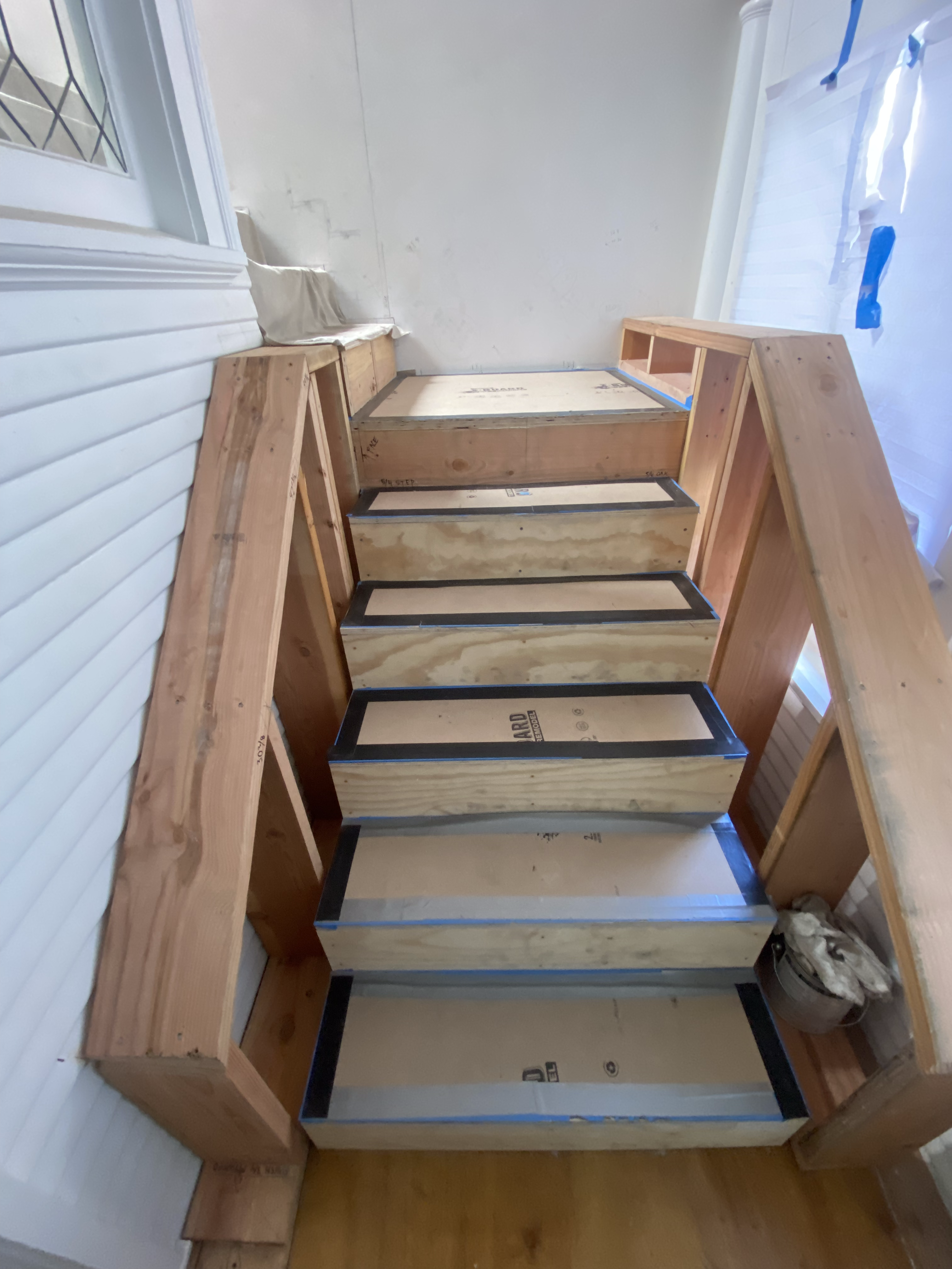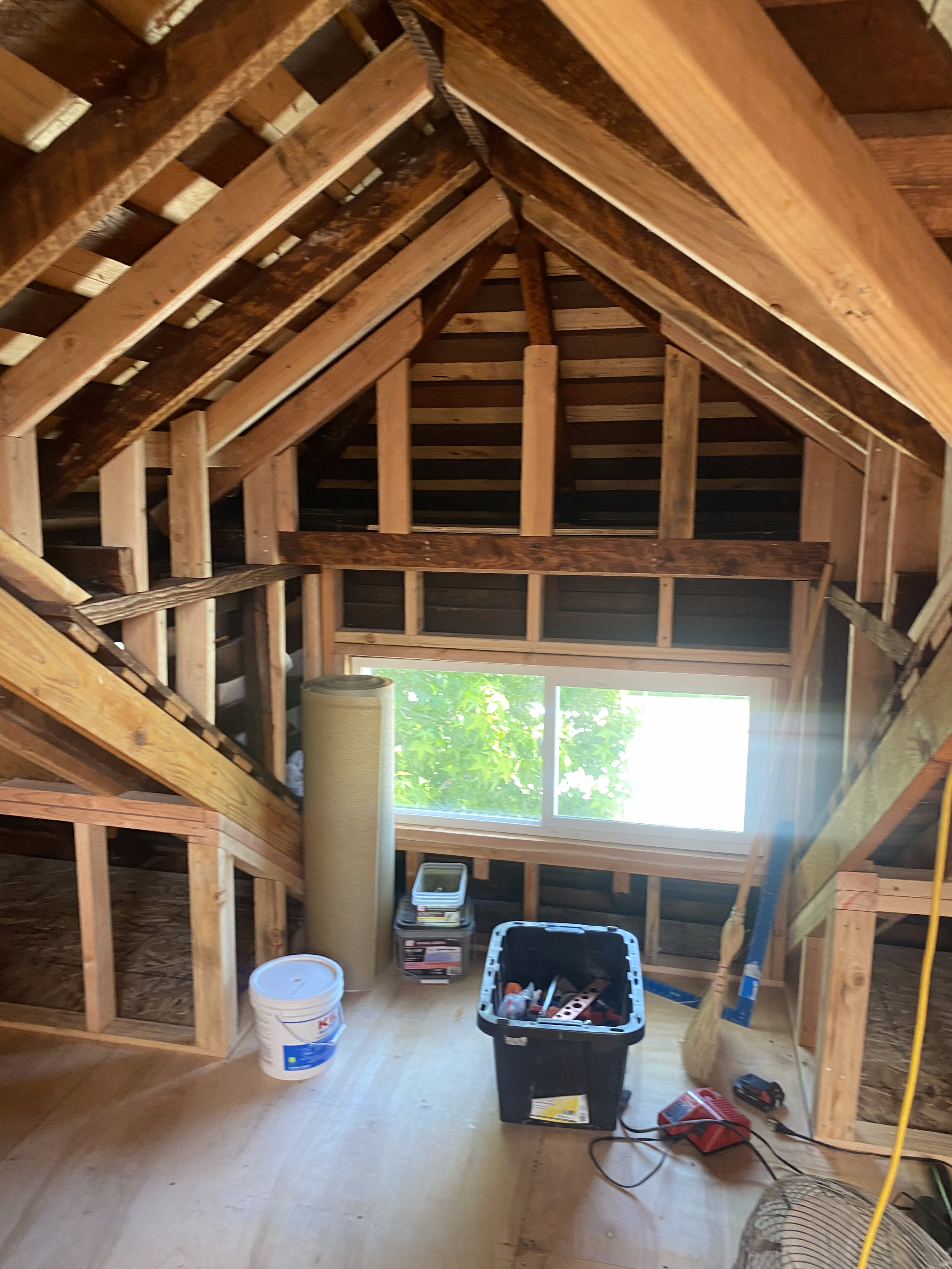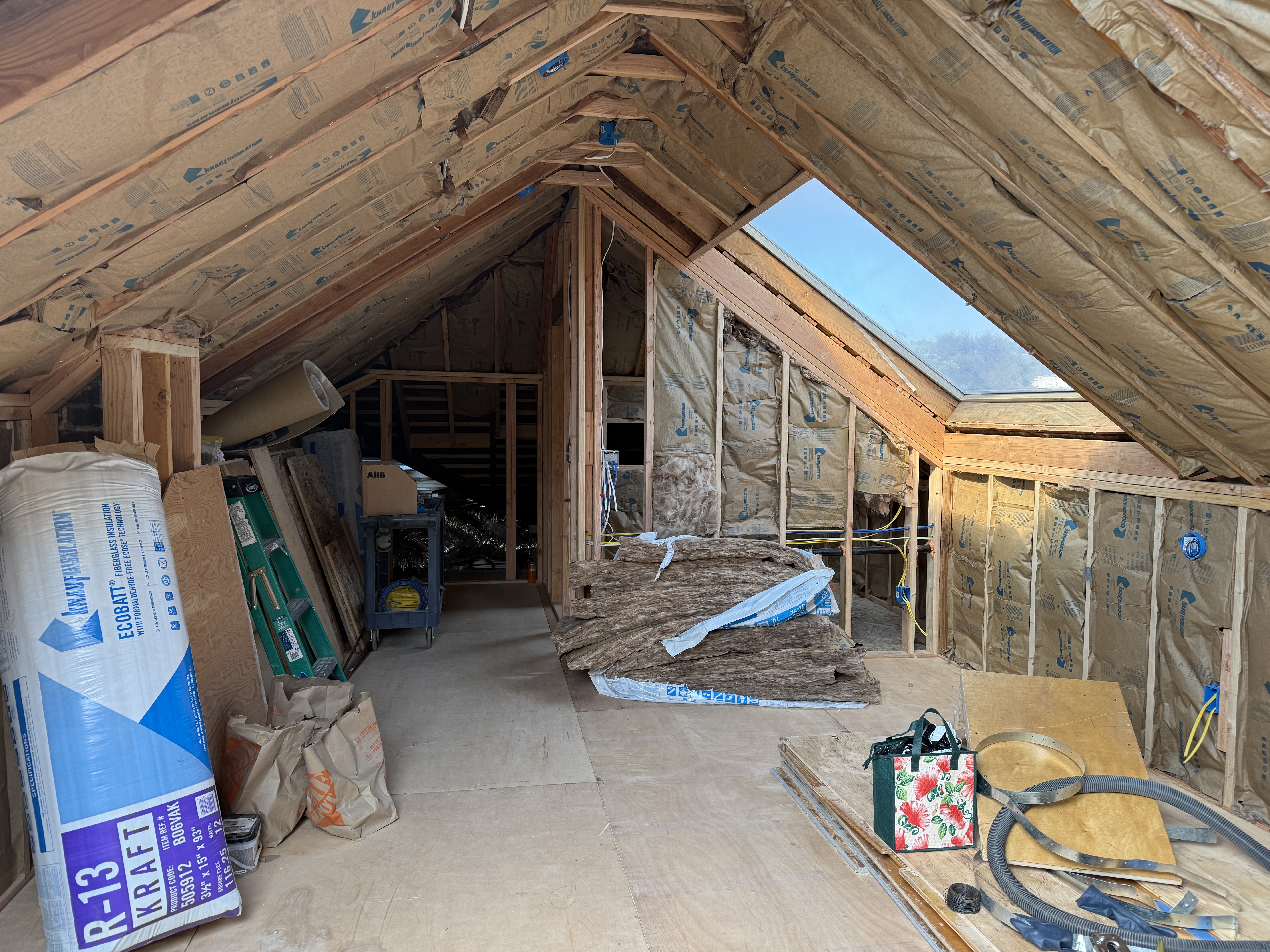 Our clients are new homeowners in Oakland. Their craftsman was subdivided into many units by a previous owner. We helped to find some more space in their own unit by expanding into and finishing the attic, placing the new stair in the underutilized enclosed sun porch. The Bugs designed the material strategy, and came up with a bathroom scheme using available overstocked Heath tile. The finished attic has one large bedroom suite with bathroom and large closets, plus an enclosed office.